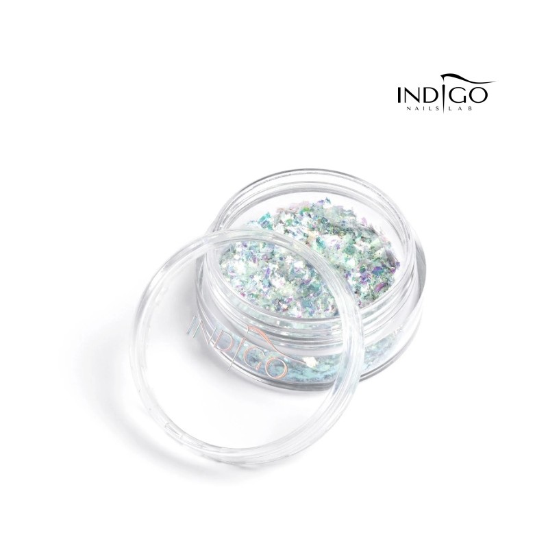 Delikatne, holograficzne płatki w odcieniach fioletu, żółtego złota i zieleni odbijają światło niczym dyskotekowa kula, nadając paznokciom intensywnie mieniący się połysk. Ich wielowymiarowy blask zachwyca i przyciąga uwagę.