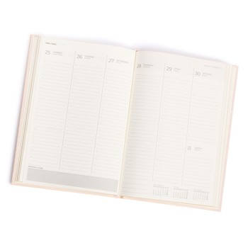 Wysokiej jakości papier w kolorze kremowym gwarantuje przyjemność z pisania i trwałość notatek przez cały rok. Dwie tasiemki umożliwiają zaznaczenie bieżącego tygodnia, a dodatkowa koperta na końcu kalendarza pomieści ważne dokumenty i notatki.